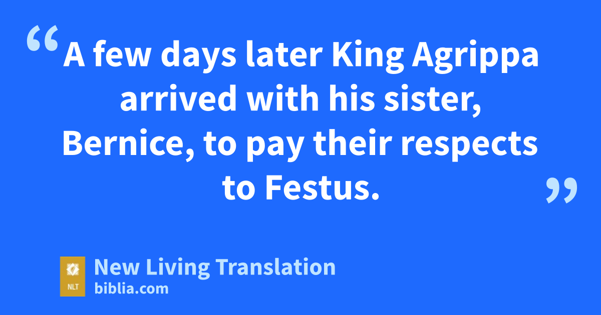 13 A few days later King Agrippa arrived with his sister, Bernice,* to pay their respects to Festus. 14 During their stay of several days, Festus discussed Paul’s case with the king. “There is a prisoner here,” he told him, “whose case was left for me by Felix. 15 When I was in Jerusalem, the leading priests and Jewish elders pressed charges against him and asked me to condemn him. 16 I pointed out to them that Roman law does not convict people without a trial. They must be given an opportunity to confront their accusers and defend themselves.