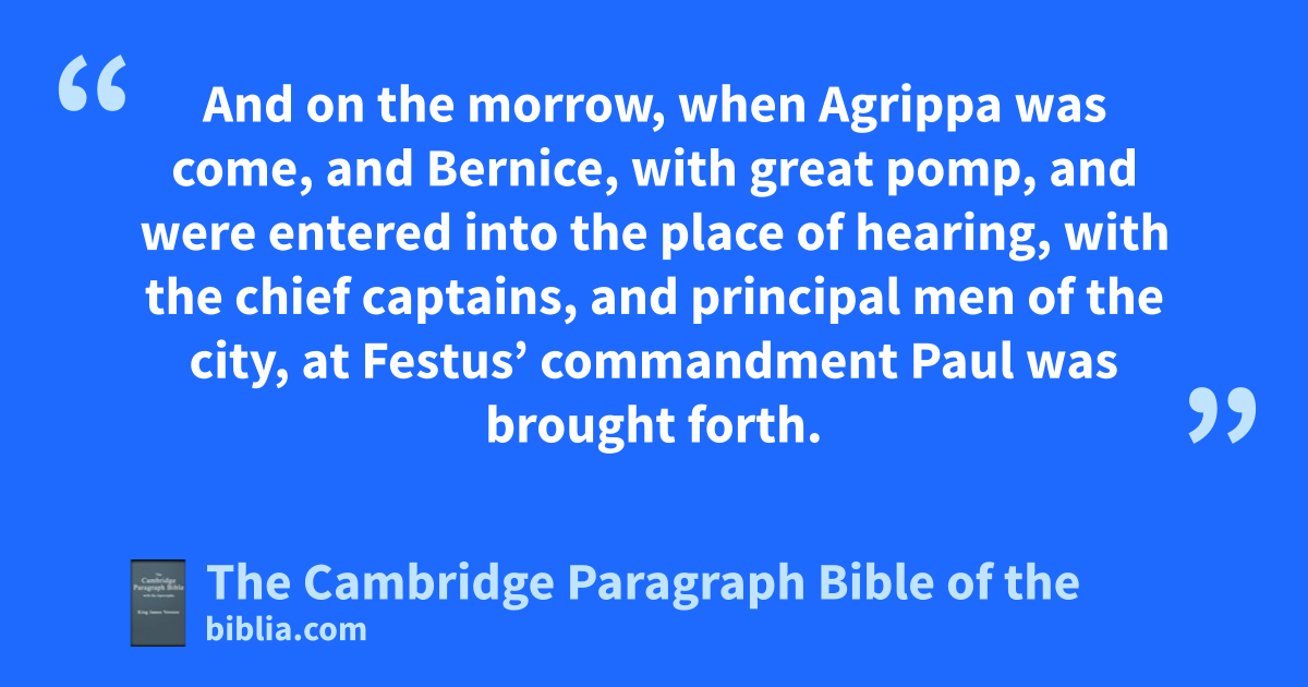 23 And on the morrow, when fAgrippa was come, and Bernice, with great pomp, and were entered into the place of hearing, with the gchief captains, and principal men of the city, at Festus’ commandment Paul was brought forth. 24 And Festus said, King Agrippa, and all men which are here present with us, ye see this man, about whom hall the multitude of the Jews have idealt with me, both at Jerusalem, and also here, crying that khe ought not to live any longer. 25 But when I found that lhe had committed nothing worthy of death, mand that he himself hath vappealed to Augustus, I have determined to send him. 26 Of whom I have no certain thing to write unto my lord. Wherefore I have brought him forth before you, and specially before thee, O king Agrippa, that, after examination had, I might have somewhat to write. 27 For it seemeth to me unreasonable to send a prisoner, and not withal to signify the acrimes laid against him.