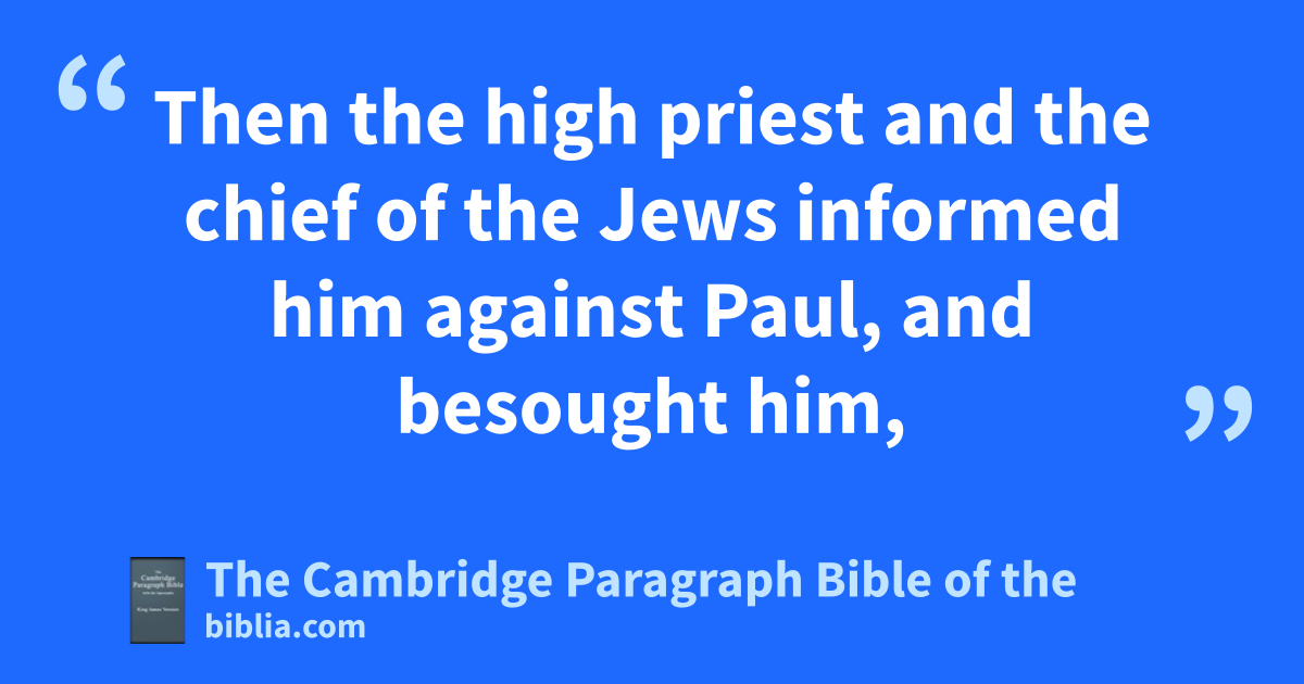 XXV. Now when Festus was come into the aprovince, bafter three days he cascended from dCesarea to Jerusalem. 2 Then ethe high priest and fthe chief of the Jews eginformed him against Paul, and besought him, 3 and desired favour against him, that he would send for him to Jerusalem, hlaying wait in the way to kill him. 4 But Festus answered, that Paul should be kept at dCesarea, and that he himself would depart shortly thither. 5 Let them therefore, said he, which among you are iable, go down with me, and accuse this man, if there be any wickedness in him. 6 And when he had tarried among them * more than ten days, he kwent down unto dCesarea; and the next day sitting in lthe judgment seat, commanded Paul to be brought. 7 And when he was come, the Jews which kcame down from Jerusalem stood round about, and laid many and grievous complaints against Paul, mwhich they could not nprove. 8 While he oanswered for himself, pNeither against the law of the Jews, neither against the temple, nor yet against Cesar, have I offended any thing at all. 9 But Festus, qwilling to do the Jews a pleasure, answered Paul, and said, rWilt thou cgo up to Jerusalem, and there be judged of these things before me? 10 Then said Paul, I stand at Cesar’s ljudgment seat, where I ought to be judged: to the Jews have I done no wrong, as thou svery well knowest. 11 tFor if I be an offender, or have committed any thing worthy of death, I refuse not to die: but if there be none of these things whereof these accuse me, no man may udeliver me unto them. vI appeal unto Cesar. 12 Then Festus, when he had conferred with the council, answered, Hast thou vappealed unto Cesar? unto Cesar shalt thou go.