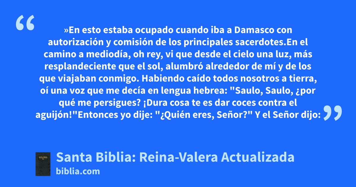 »En esto estaba ocupado cuando iba a Damasco con autorización y comisión de los principales sacerdotes.En el camino a mediodía, oh rey, vi que desde el cielo una luz, más resplandeciente que el sol, alumbró alrededor de mí y de los que viajaban conmigo. Habiendo caído todos nosotros a tierra, oí una voz que me decía en lengua hebrea: "Saulo, Saulo, ¿por qué me persigues? ¡Dura cosa te es dar coces contra el aguijón!"Entonces yo dije: "¿Quién eres, Señor?" Y el Señor dijo: