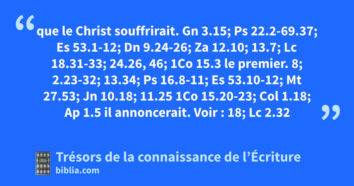 que le Christ souffrirait. Gn 3.15; Ps 22.2-69.37; Es 53.1-12; Dn 9.24-26; Za 12.10; 13.7; Lc 18.31-33; 24.26, 46; 1Co 15.3 le premier. 8; 2.23-32; 13.34; Ps 16.8-11; Es 53.10-12; Mt 27.53; Jn 10.18; 11.25 1Co 15.20-23; Col 1.18; Ap 1.5 il annoncerait. Voir : 18; Lc 2.32