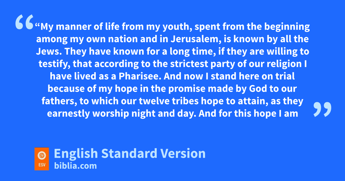 4 p“My manner of life from my youth, spent from the beginning among qmy own nation and in Jerusalem, is known by all the Jews. 5 They have known for a long time, if they are willing to testify, that raccording to the strictest sparty of our treligion I have lived as ua Pharisee. 6 And now I stand here on trial because of my hope in vthe promise made by God to our fathers, 7 wto which xour twelve tribes hope to yattain, as they earnestly worship night and day. And for this hope zI am accused by Jews, O king! 8 Why is it thought aincredible by any of you that God raises the dead?