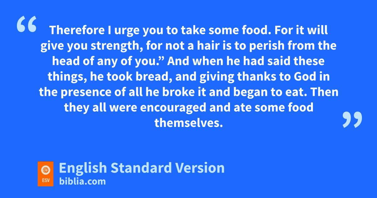 33 As day was about to dawn, Paul urged them all to take some food, saying, “Today is the fourteenth day that you have continued in suspense and without food, having taken nothing. 34 Therefore I urge you to take some food. For it will give you strength,6 for bnot a hair is to perish from the head of any of you.” 35 And when he had said these things, he took bread, and cgiving thanks to God in the presence of all he broke it and began to eat. 36 Then they all dwere encouraged and ate some food themselves. 37 (We were in all 2767 epersons in the ship.) 38 And when they had eaten enough, they lightened the ship, fthrowing out the wheat into the sea.