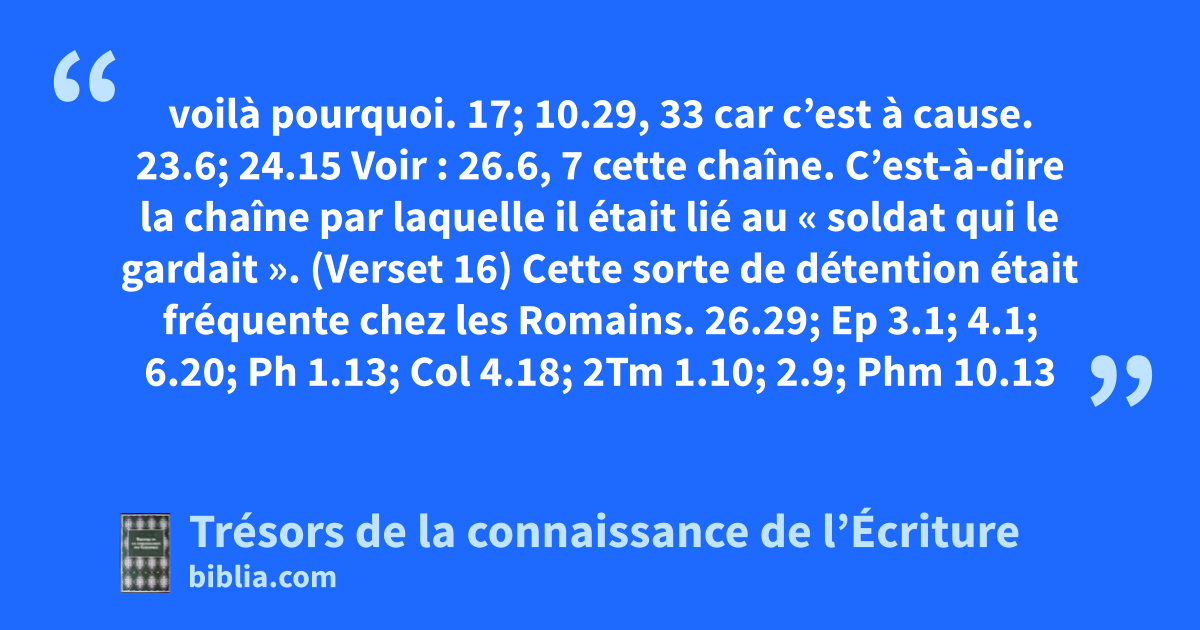 voilà pourquoi. 17; 10.29, 33 car c’est à cause. 23.6; 24.15 Voir : 26.6, 7 cette chaîne. C’est-à-dire la chaîne par laquelle il était lié au « soldat qui le gardait ». (Verset 16) Cette sorte de détention était fréquente chez les Romains. 26.29; Ep 3.1; 4.1; 6.20; Ph 1.13; Col 4.18; 2Tm 1.10; 2.9; Phm 10.13