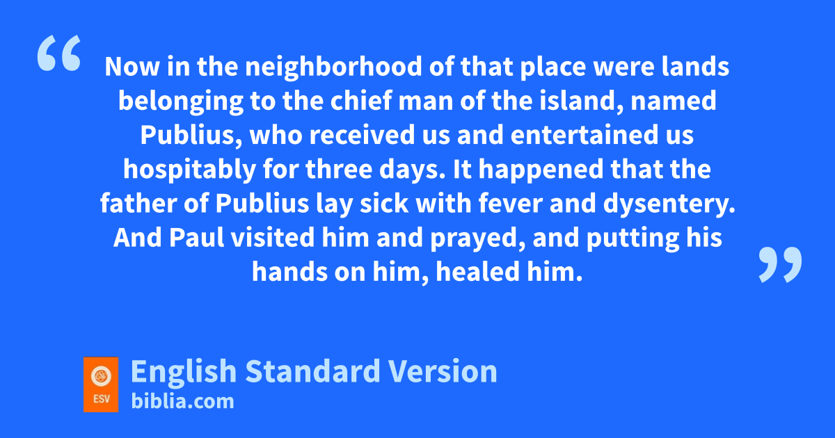 7 Now in the neighborhood of that place were lands belonging to the chief man of the island, named Publius, who received us and entertained us hospitably for three days. 8 It happened that the father of Publius lay sick with fever and dysentery. And Paul visited him and vprayed, and wputting his hands on him, healed him. 9 And when this had taken place, the rest of the people on the island who had diseases also came and were cured. 10 They also honored us greatly,3 and when we were about to sail, they put on board whatever we needed.