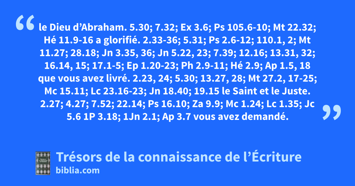 le Dieu d’Abraham. 5.30; 7.32; Ex 3.6; Ps 105.6-10; Mt 22.32; Hé 11.9-16 a glorifié. 2.33-36; 5.31; Ps 2.6-12; 110.1, 2; Mt 11.27; 28.18; Jn 3.35, 36; Jn 5.22, 23; 7.39; 12.16; 13.31, 32; 16.14, 15; 17.1-5; Ep 1.20-23; Ph 2.9-11; Hé 2.9; Ap 1.5, 18 que vous avez livré. 2.23, 24; 5.30; 13.27, 28; Mt 27.2, 17-25; Mc 15.11; Lc 23.16-23; Jn 18.40; 19.15