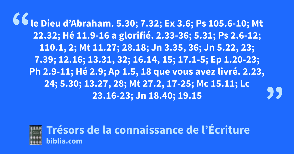 le Dieu d’Abraham. 5.30; 7.32; Ex 3.6; Ps 105.6-10; Mt 22.32; Hé 11.9-16 a glorifié. 2.33-36; 5.31; Ps 2.6-12; 110.1, 2; Mt 11.27; 28.18; Jn 3.35, 36; Jn 5.22, 23; 7.39; 12.16; 13.31, 32; 16.14, 15; 17.1-5; Ep 1.20-23; Ph 2.9-11; Hé 2.9; Ap 1.5, 18 que vous avez livré. 2.23, 24; 5.30; 13.27, 28; Mt 27.2, 17-25; Mc 15.11; Lc 23.16-23; Jn 18.40; 19.15