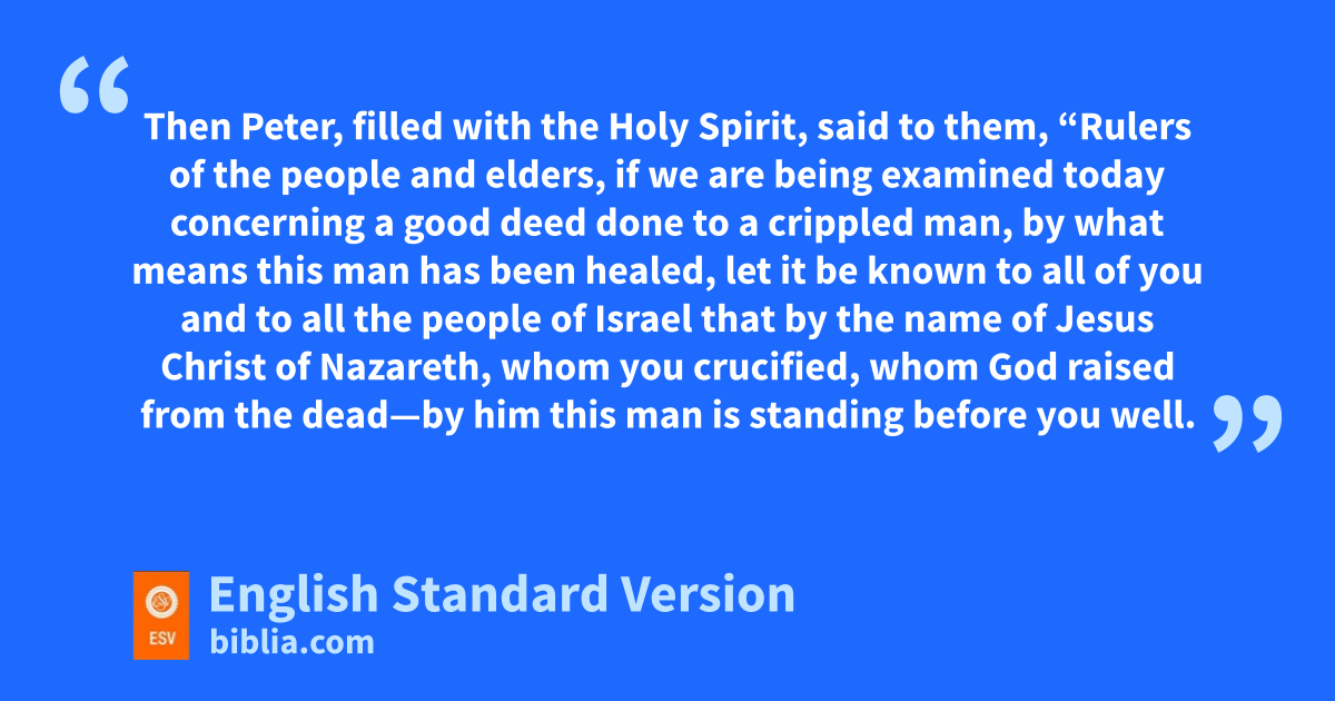 5 On the next day their rulers and elders and scribes gathered together in Jerusalem, 6 with qAnnas the high priest and rCaiaphas and John and Alexander, and all who were of the high-priestly family. 7 And when they had set them in the midst, they inquired, s“By what power or tby what name did you do this?” 8 Then Peter, ufilled with the Holy Spirit, said to them, “Rulers of the people and elders, 9 if we are being examined today vconcerning a good deed done to a crippled man, by what means this man has been healed, 10 let it be known to all of you and to all the people of Israel that wby the name of Jesus Christ of Nazareth, whom you crucified, xwhom God raised from the dead—by him this man is standing before you well. 11 yThis Jesus1 is the stone that was zrejected by you, the builders, which has become the cornerstone.2 12 And there is asalvation bin no one else, for cthere is no other dname under heaven given among men3 by which we must be saved.”