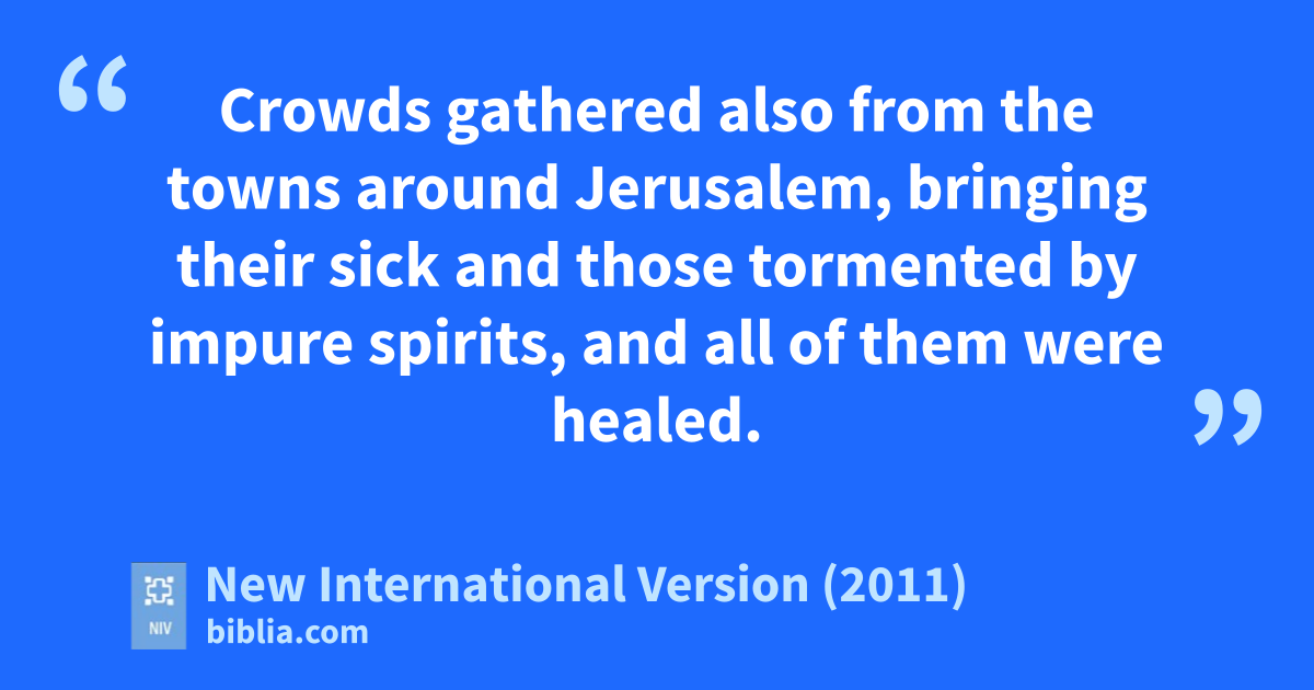 12 The apostles performed many signs and wondersm among the people. And all the believers used to meet togethern in Solomon’s Colonnade.o 13 No one else dared join them, even though they were highly regarded by the people.p 14 Nevertheless, more and more men and women believed in the Lord and were added to their number.q 15 As a result, people brought the sick into the streets and laid them on beds and mats so that at least Peter’s shadow might fall on some of them as he passed by.r 16 Crowds gathered also from the towns around Jerusalem, bringing their sick and those tormented by impure spirits, and all of them were healed.s