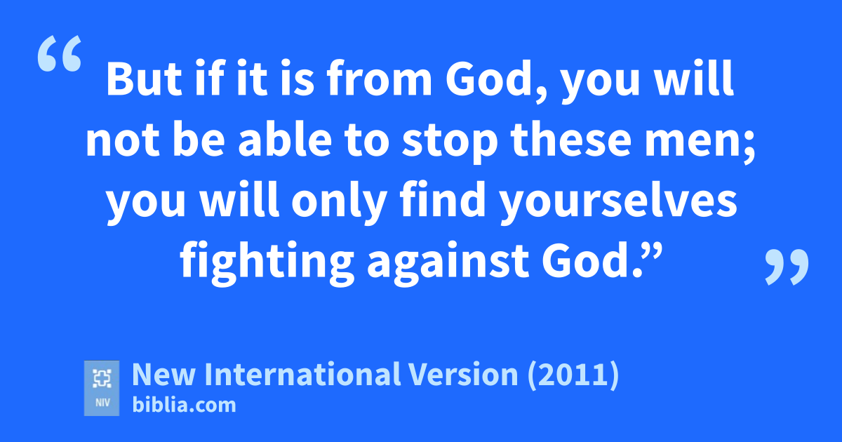 33 When they heard this, they were furiousr and wanted to put them to death. 34 But a Pharisee named Gamaliel,s a teacher of the law,t who was honored by all the people, stood up in the Sanhedrin and ordered that the men be put outside for a little while. 35 Then he addressed the Sanhedrin: “Men of Israel, consider carefully what you intend to do to these men. 36 Some time ago Theudas appeared, claiming to be somebody, and about four hundred men rallied to him. He was killed, all his followers were dispersed, and it all came to nothing. 37 After him, Judas the Galilean appeared in the days of the censusu and led a band of people in revolt. He too was killed, and all his followers were scattered. 38 Therefore, in the present case I advise you: Leave these men alone! Let them go! For if their purpose or activity is of human origin, it will fail.v 39 But if it is from God, you will not be able to stop these men; you will only find yourselves fighting against God.”w