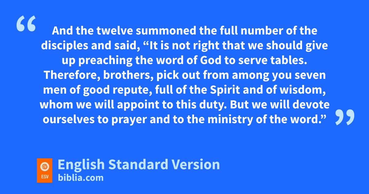 6 Now in these days kwhen the disciples were increasing in number, a complaint by the Hellenists1 arose against the Hebrews because their widows were being neglected in lthe daily distribution. 2 And the twelve summoned the full number of the disciples and said, “It is not right that we should give up preaching the word of God to serve tables. 3 mTherefore, brothers,2 pick out from among you seven men nof good repute, ofull of the Spirit and of wisdom, whom we will appoint to this duty. 4 But pwe will devote ourselves to prayer and to the ministry of the word.” 5 And what they said pleased the whole gathering, and they chose Stephen, qa man full of faith and rof the Holy Spirit, and sPhilip, and Prochorus, and Nicanor, and Timon, and Parmenas, and Nicolaus, ta proselyte of Antioch. 6 These they set before the apostles, and uthey prayed and vlaid their hands on them.