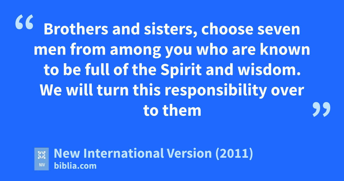 6 In those days when the number of disciples was increasing,d the Hellenistic Jewsa e among them complained against the Hebraic Jews because their widowsf were being overlooked in the daily distribution of food.g 2 So the Twelve gathered all the disciplesh together and said, “It would not be right for us to neglect the ministry of the word of Godi in order to wait on tables. 3 Brothers and sisters,j choose seven men from among you who are known to be full of the Spiritk and wisdom. We will turn this responsibility over to theml 4 and will give our attention to prayerm and the ministry of the word.”