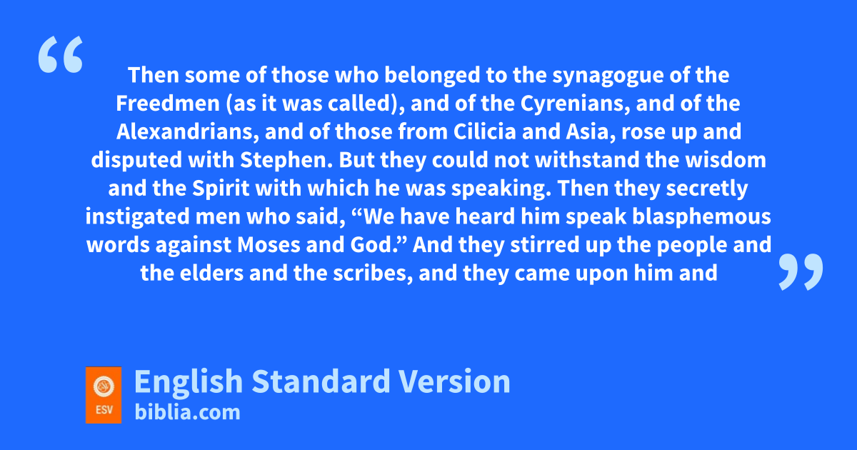 8 And Stephen, full of grace and zpower, was doing great wonders and signs among the people. 9 Then some of those who belonged to the synagogue of the Freedmen (as it was called), and of the Cyrenians, and of the Alexandrians, and of those from Cilicia and Asia, rose up and disputed with Stephen. 10 But athey could not withstand the wisdom and the Spirit with which he was speaking. 11 Then bthey secretly instigated men who said, “We have heard him speak blasphemous words against Moses and God.” 12 And they stirred up the people and the elders and the scribes, and they came upon him and seized him and brought him before the council, 13 and they cset up false dwitnesses who said, “This man never ceases to speak words against ethis holy place and the law, 14 for we have heard him say that this Jesus of Nazareth fwill destroy this place and will gchange hthe customs that Moses delivered to us.” 15 And gazing at him, all who sat in the council saw that his face iwas like the face of an angel.