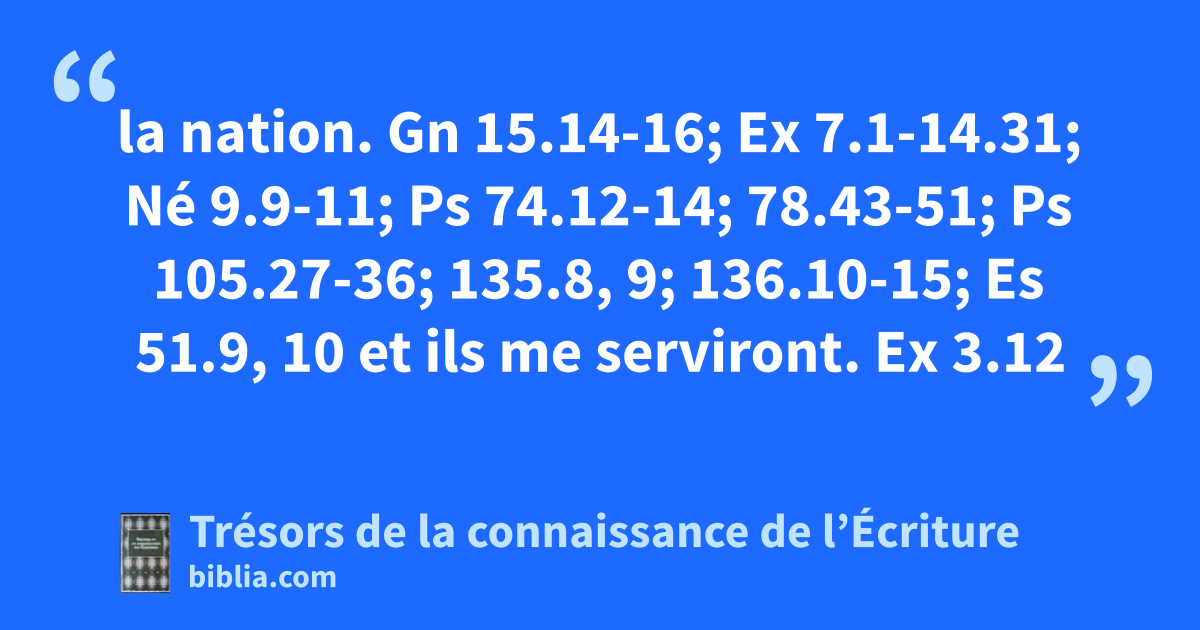 la nation. Gn 15.14-16; Ex 7.1-14.31; Né 9.9-11; Ps 74.12-14; 78.43-51; Ps 105.27-36; 135.8, 9; 136.10-15; Es 51.9, 10 et ils me serviront. Ex 3.12