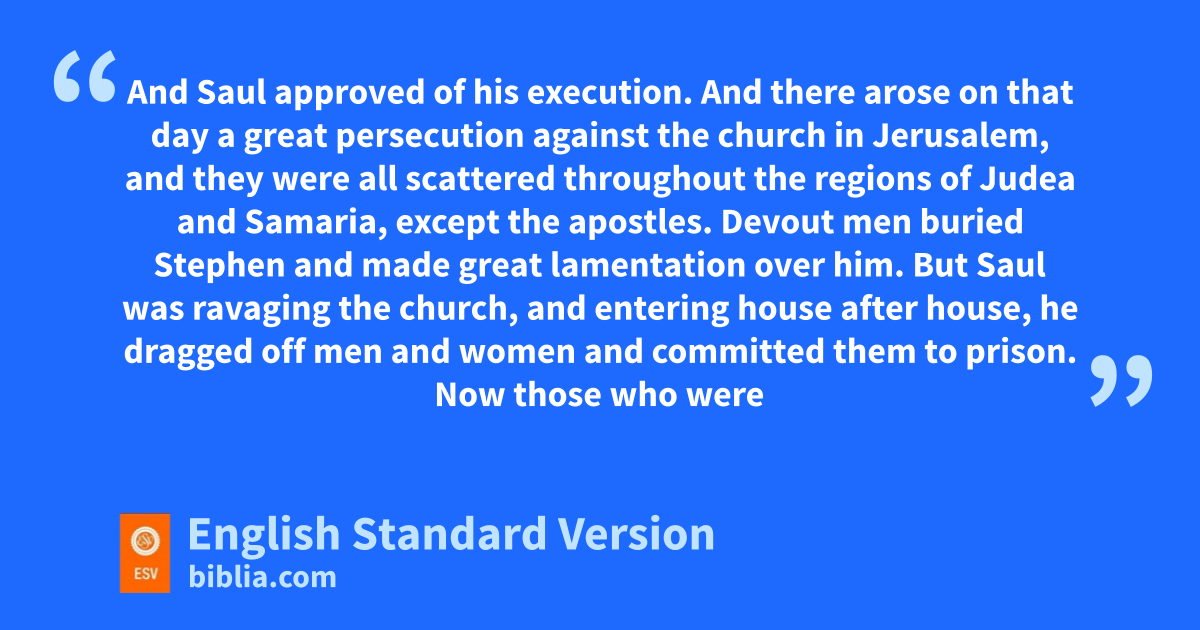 And there arose on that day a great persecution against the church in Jerusalem, and dthey were all scattered throughout the regions of Judea and Samaria, except the apostles. 2 Devout men buried Stephen and made great lamentation over him. 3 But eSaul was ravaging the church, and entering house after house, he fdragged off men and women and committed them to prison.