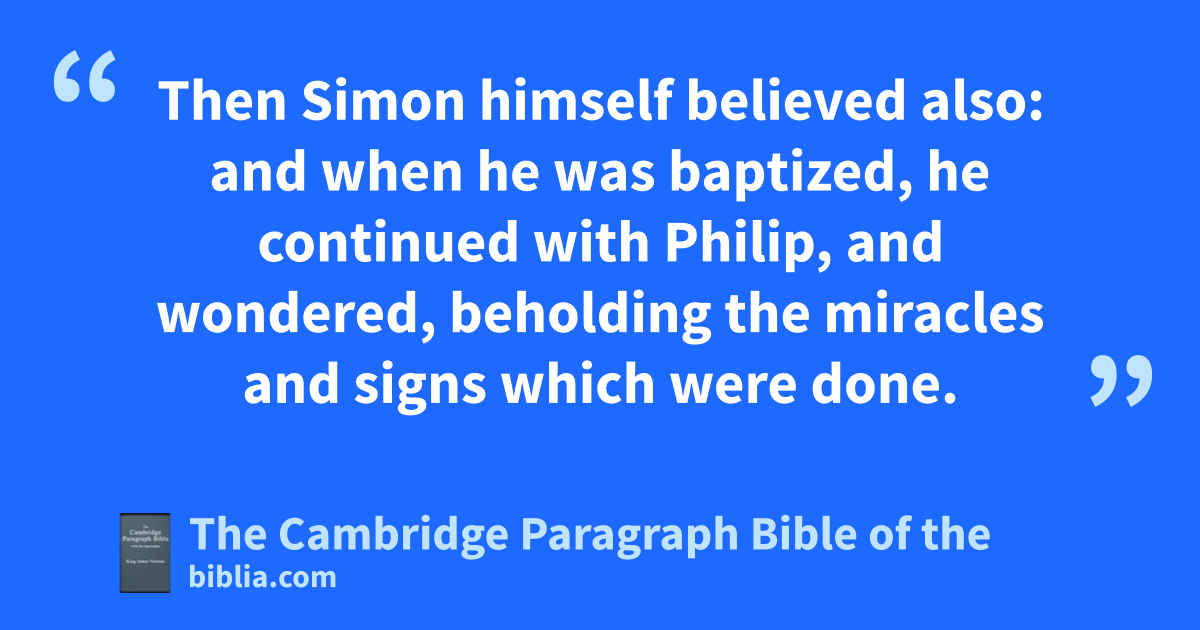 5 Then kPhilip went down to the city of Samaria, and preached Christ unto them. 6 And the people with one accord gave heed unto those things which Philip spake, hearing and seeing the miracles which he did. 7 For lunclean spirits, mcrying with loud voice, came out of many that were possessed with them: and many taken with palsies, and that were lame, were healed. 8 And there was ngreat joy in that city. 9 But there was a certain man, called Simon, which beforetime in the same city oused sorcery, and pbewitched the people of Samaria, qgiving out that himself was some great one: 10 to whom they all gave heed, rfrom the least to the greatest, saying, sThis man is the great power of God. 11 And to him they thad regard, because that of long time he had pbewitched them with osorceries. 12 But when they believed Philip preaching uthe things concerning the kingdom of God, and the name of Jesus Christ, they were baptized, both men and women. 13 Then Simon himself believed also: and when he was baptized, he vcontinued with Philip, and pwondered, beholding the * miracles and signs which were done.