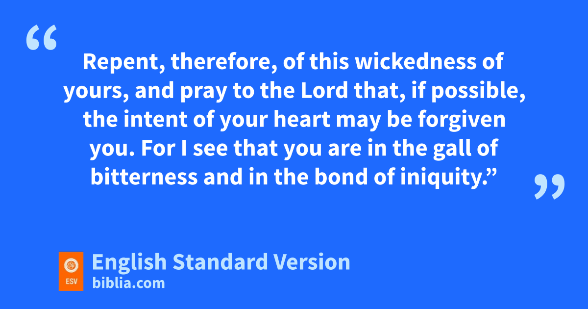 14 Now when wthe apostles at Jerusalem heard that xSamaria had received the word of God, they sent to them Peter and John, 15 who came down and prayed for them ythat they might receive the Holy Spirit, 16 for zhe had not yet afallen on any of them, but bthey had only been baptized in the name of the Lord Jesus. 17 Then cthey laid their hands on them and dthey received the Holy Spirit. 18 Now when Simon saw that the Spirit was given through the laying on of the apostles’ hands, he offered them money, 19 saying, “Give me this power also, so that anyone on whom I lay my hands may receive the Holy Spirit.” 20 But Peter said to him, e“May your silver perish with you, because you thought you could obtain the gift of God fwith money! 21 You have neither part nor lot in this matter, for gyour heart is not right before God. 22 Repent, therefore, of this wickedness of yours, and pray to the Lord that, hif possible, the intent of your heart may be forgiven you. 23 For I see that you are in ithe gall3 of bitterness and in jthe bond of iniquity.” 24 And Simon answered, k“Pray for me to the Lord, that nothing of what you have said may come upon me.”