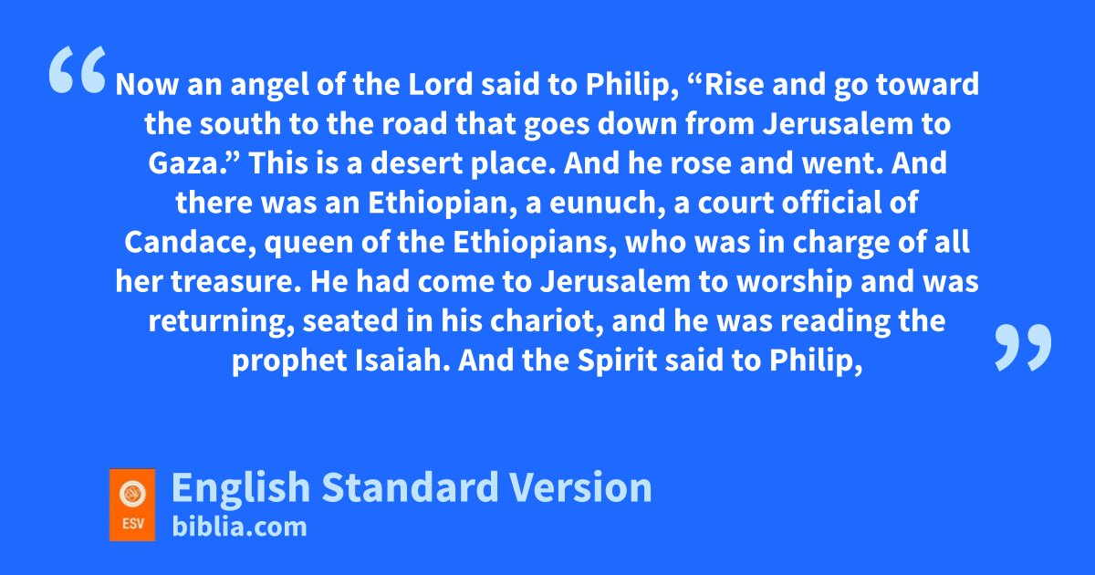 26 Now man angel of the Lord said to Philip, “Rise and go toward the south4 to the road that goes down from Jerusalem to Gaza.” This is a desert place. 27 And he rose and went. And there was an nEthiopian, a oeunuch, a court official of Candace, queen of the Ethiopians, pwho was in charge of all her treasure. qHe had come to Jerusalem to worship 28 and was returning, seated in his chariot, and he was reading the prophet Isaiah. 29And the Spirit said to Philip, “Go over and join this chariot.” 30 So Philip ran to him and heard him reading Isaiah the prophet and asked, “Do you understand what you are reading?” 31 And he said, r“How can I, unless someone sguides me?” And the invited Philip to come up and sit with him. 32 Now the passage of the Scripture that he was reading was this: