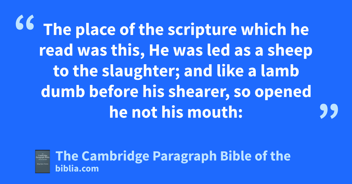 26 And qthe angel of the Lord spake unto rPhilip, saying, Arise, and go toward the south unto the way that goeth down from Jerusalem unto sGaza, which is desert. 27 And he arose and went: and behold, ta man of Ethiopia, uan eunuch wof great authority under Candace queen of the xEthiopians, who had ythe charge of all her treasure, and zhad come to Jerusalem for to worship, 28 was returning, and sitting in his chariot read Esaias the prophet. 29 Then the Spirit said unto Philip, Go near, and join thyself to this chariot. 30 And Philip ran thither to him, and heard him read the prophet Esaias, and said, aUnderstandest thou what thou readest? 31 And he said, How can I, except some man should bguide me? And che desired Philip that he would come up and sit with him. 32 The place of the scripture which he read was this, dHe was led as a sheep to the slaughter; and like a lamb dumb before his shearer, so opened he not his mouth: 33 in his humiliation his judgment was taken away: and who shall declare his generation? for his life is taken from the earth. 34 And the eunuch answered Philip, and said, I pray thee, of whom speaketh the prophet this? of himself, or of some other man? 35 Then Philip eopened his mouth, and fbegan at the same gscripture, and hpreached unto him Jesus. 36 And as they went on their way, they came unto a certain water: and the eunuch said, See, here is water; what doth ihinder me to be baptized? 37 And Philip said, jIf thou believest with all thine heart, kthou mayest. And he answered and said, I believe that lJesus Christ is mthe Son of God. 38 And he commanded the chariot to stand still: and they went down both into the water, both Philip and the eunuch; and he baptized him. 39 And when they were come up out of the water, nthe Spirit of the Lord caught away Philip, that the eunuch saw him no more: and he went on his way orejoicing. 40 But Philip was found at pAzotus: and passing through he qpreached in all the cities, till he came to rCesarea.