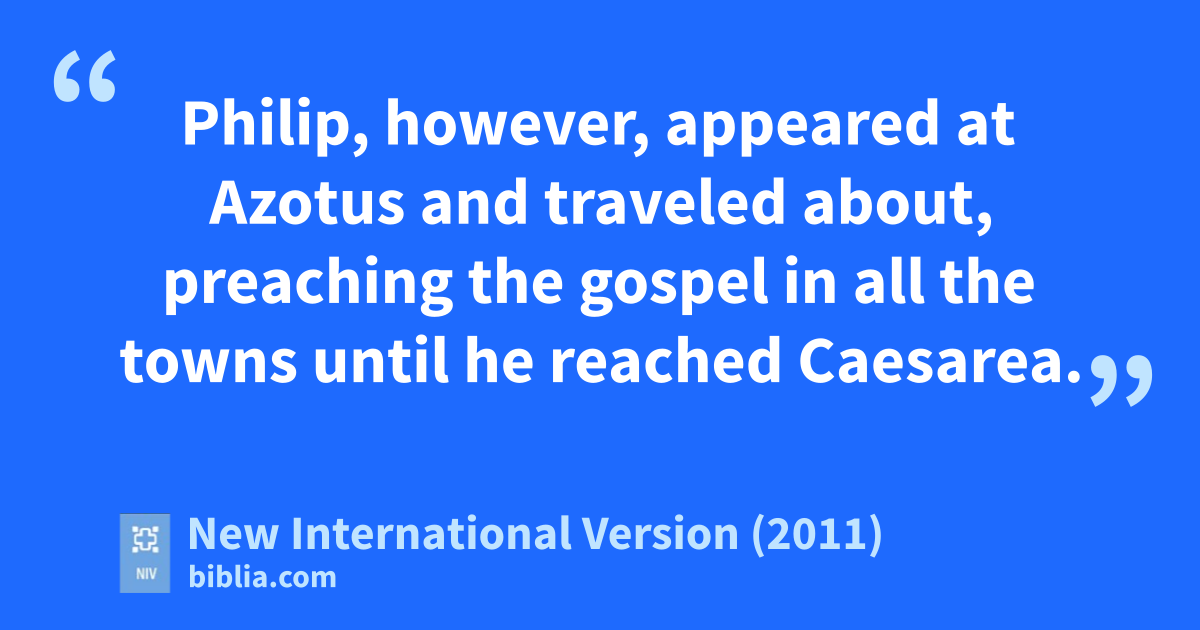 36 As they traveled along the road, they came to some water and the eunuch said, “Look, here is water. What can stand in the way of my being baptized?”b [37]c 38 And he gave orders to stop the chariot. Then both Philip and the eunuch went down into the water and Philip baptized him. 39 When they came up out of the water, the Spirit of the Lord suddenly took Philip away,c and the eunuch did not see him again, but went on his way rejoicing. 40 Philip, however, appeared at Azotus and traveled about, preaching the gospel in all the townsd until he reached Caesarea.e