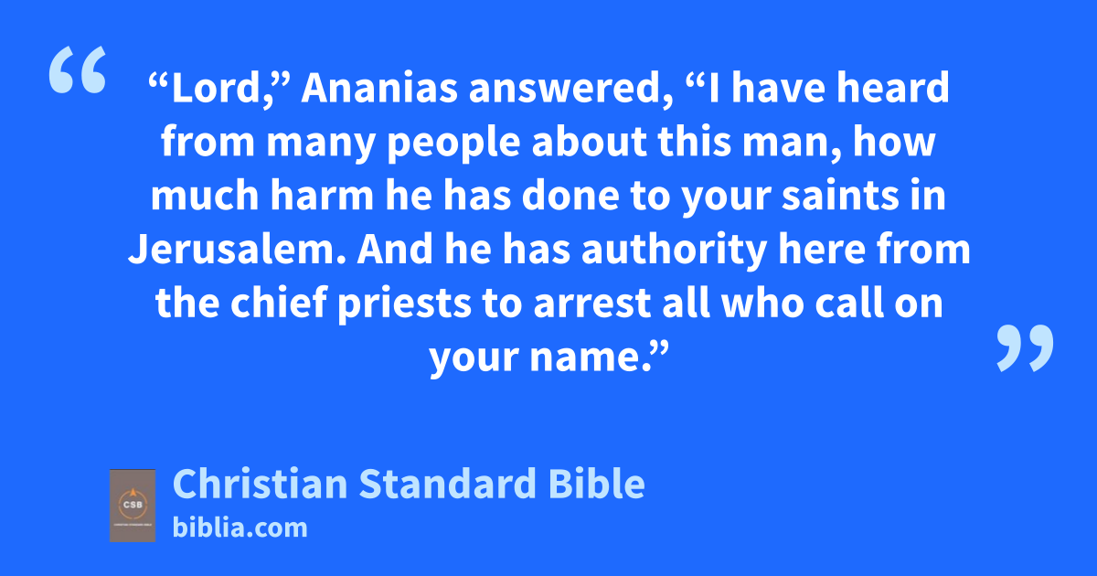 13 “Lord,” Ananias answered, “I have heard from many people about this man, how much harm he has done to your saints in Jerusalem.m 14 And he has authority here from the chief priests to arrest all who call on your name.”n