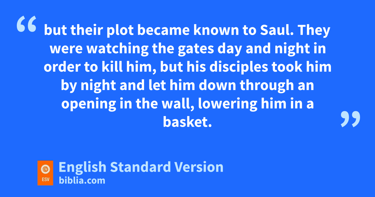 23 pWhen many days had passed, the Jews1 plotted to kill him, 24 but their qplot became known to Saul. rThey were watching the gates day and night in order to kill him, 25 but his disciples took him by night and slet him down through an opening in the wall,2 lowering him in a basket.