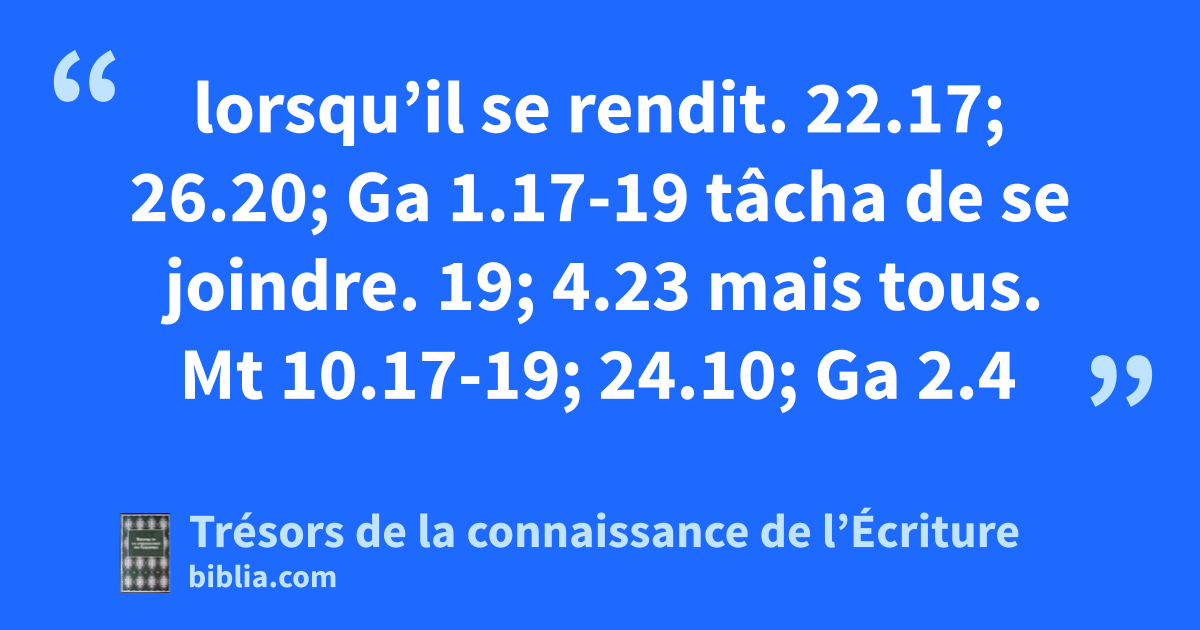 lorsqu’il se rendit. 22.17; 26.20; Ga 1.17-19 tâcha de se joindre. 19; 4.23 mais tous. Mt 10.17-19; 24.10; Ga 2.4