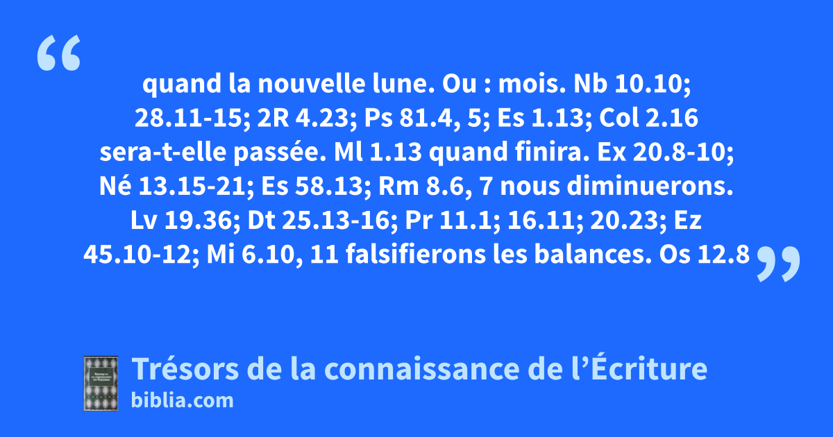 quand la nouvelle lune. Ou : mois. Nb 10.10; 28.11-15; 2R 4.23; Ps 81.4, 5; Es 1.13; Col 2.16 sera-t-elle passée. Ml 1.13 quand finira. Ex 20.8-10; Né 13.15-21; Es 58.13; Rm 8.6, 7 nous diminuerons. Lv 19.36; Dt 25.13-16; Pr 11.1; 16.11; 20.23; Ez 45.10-12; Mi 6.10, 11 falsifierons les balances. Os 12.8