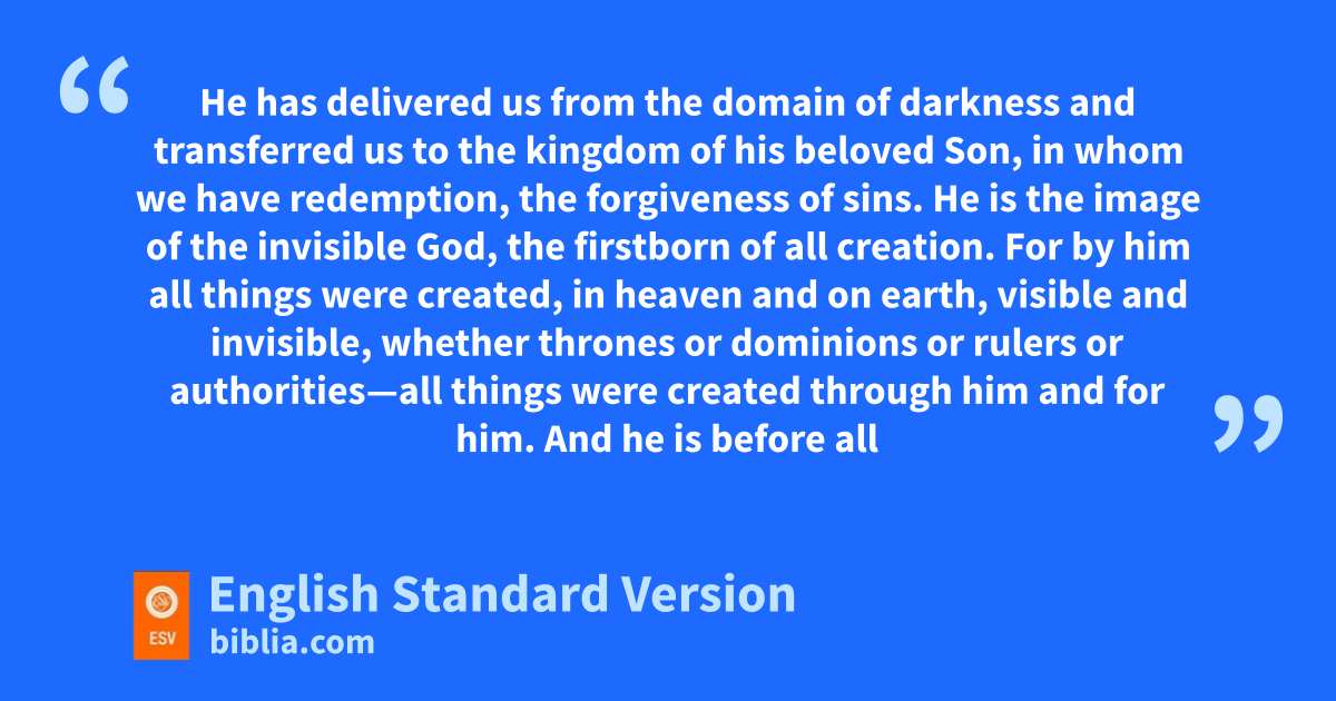 15 iHe is the image of jthe invisible God, kthe firstborn of all creation. 16 For by6 him all things were created, lin heaven and on earth, visible and invisible, whether mthrones or ndominions or rulers or authorities—all things were created othrough him and for him. 17 And phe is before all things, and in him all things qhold together. 18 And rhe is the head of the body, the church. He is sthe beginning, tthe firstborn from the dead, that in everything he might be preeminent. 19 For uin him all the vfullness of God was pleased to dwell, 20 and wthrough him to reconcile to himself all things, whether on earth or in heaven, xmaking peace yby the blood of his cross.