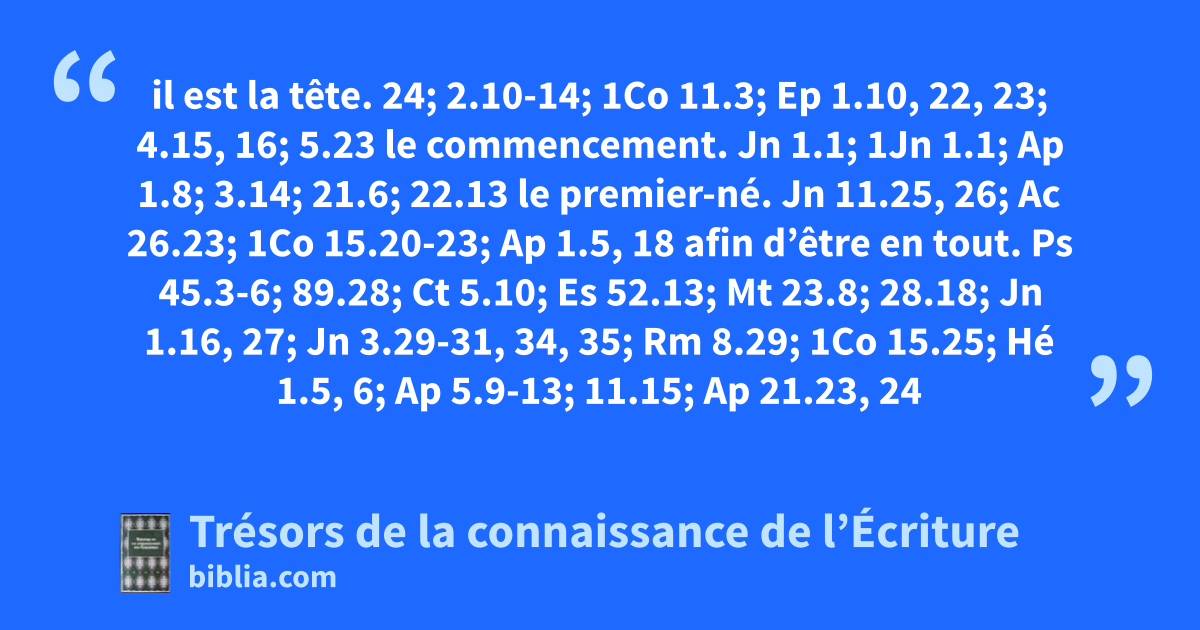 il est la tête. 24; 2.10-14; 1Co 11.3; Ep 1.10, 22, 23; 4.15, 16; 5.23 le commencement. Jn 1.1; 1Jn 1.1; Ap 1.8; 3.14; 21.6; 22.13 le premier-né. Jn 11.25, 26; Ac 26.23; 1Co 15.20-23; Ap 1.5, 18 afin d’être en tout. Ps 45.3-6; 89.28; Ct 5.10; Es 52.13; Mt 23.8; 28.18; Jn 1.16, 27; Jn 3.29-31, 34, 35; Rm 8.29; 1Co 15.25; Hé 1.5, 6; Ap 5.9-13; 11.15; Ap 21.23, 24