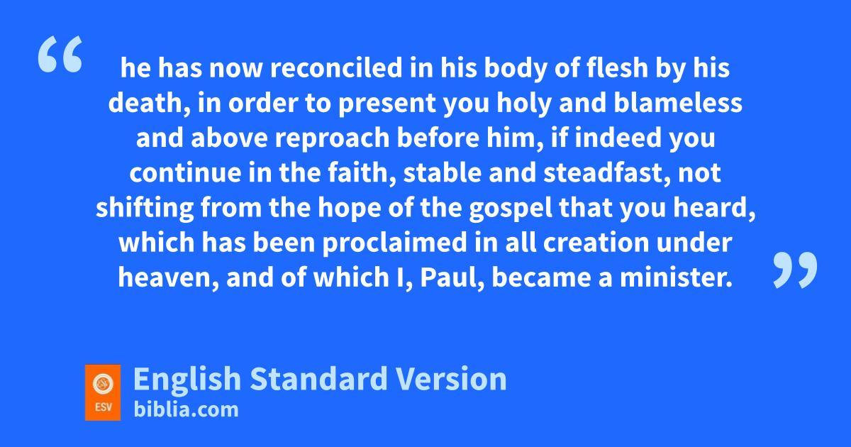 21 zAnd you, who once were alienated and hostile in mind, adoing evil deeds, 22 he has now reconciled bin his body of flesh by his death, cin order to present you holy and blameless and dabove reproach before him, 23 eif indeed you continue in the faith, fstable and steadfast, not shifting from gthe hope of the gospel that you heard, which has been proclaimed hin all creation7 under heaven, iand of which I, Paul, became a minister.