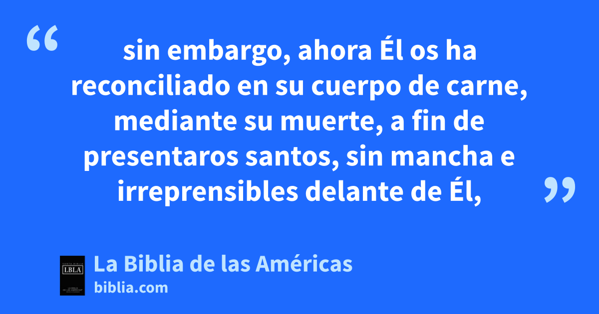 22 sin embargo, ahora Él os ha reconciliadoa en su cuerpo de carneb, mediante su muerte, a fin de presentaros santos, sin mancha e irreprensiblesc delante de Él,