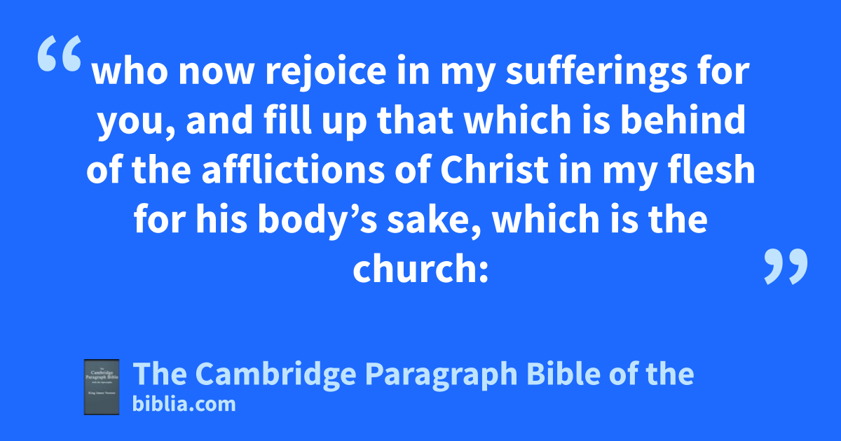 21 kAnd you, that were ksometimes lalienated and menemies * in your mind nby wicked works, yet now hath he reconciled 22 oin the body of his flesh through death, pto present you holy and unblameable and qunreproveable in his sight: 23 rif ye continue in the faith sgrounded and tsettled, and be not moved away from uthe hope of the gospel, which ye have heard, and wwhich was preached xto every creature which is under heaven; ywhereof I Paul am made a minister; 24 zwho now rejoice in my sufferings afor you, and fill up bthat which is behind of the afflictions of Christ in my flesh cfor dhis body’s sake, which is the church: 25 ywhereof I am made a minister, according to ethe dispensation of God which is given to me for you, * to fulfil the word of God; 26 even fthe mystery which hath been hid from ages and from ggenerations, fhbut now is made manifest to his saints: 27 ito whom God would make known what is kthe riches of the glory of this fmystery among the Gentiles; which is Christ * in you, lthe hope of glory: 28 whom we preach, mwarning every man, and mteaching every man mmin all wisdom; nthat we may present every man operfect in Christ Jesus: 29 whereunto pI also labour, qstriving raccording to his working, which sworketh in me mightily.