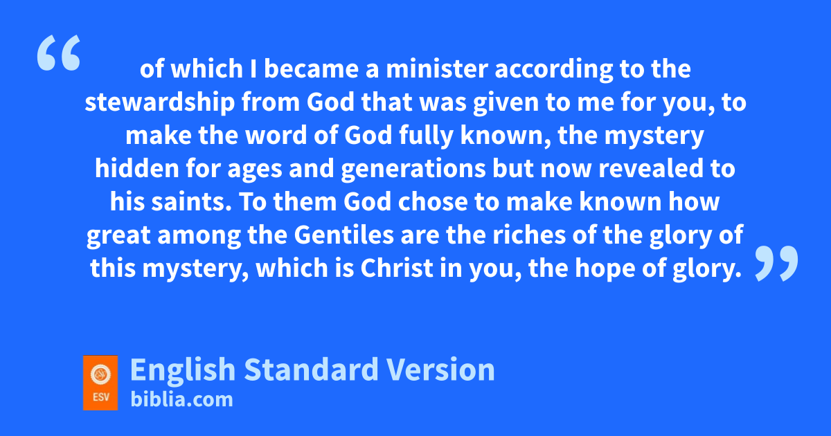 24 Now jI rejoice in my sufferings for your sake, and in my flesh kI am filling up lwhat is lacking in Christ’s afflictions mfor the sake of his body, that is, the church, 25 nof which I became a minister according to othe stewardship from God that was given to me for you, to make the word of God fully known, 26 pthe mystery hidden for ages and generations but now revealed to his saints. 27 qTo them God chose to make known how great among the Gentiles are rthe riches of the glory of pthis mystery, which is Christ in you, sthe hope of glory. 28 Him we proclaim, warning everyone and teaching everyone with all wisdom, that twe may present everyone umature in Christ. 29 For this vI toil, wstruggling xwith all his energy that he powerfully works within me.