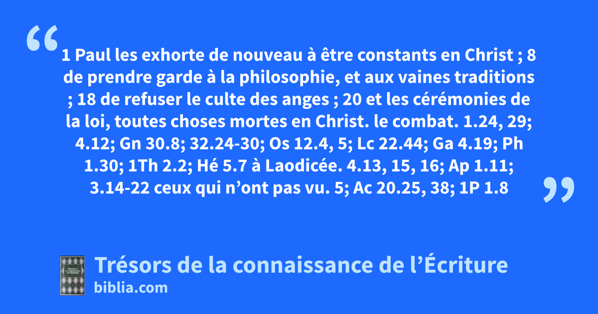 le combat. 1.24, 29; 4.12; Gn 30.8; 32.24-30; Os 12.4, 5; Lc 22.44; Ga 4.19; Ph 1.30; 1Th 2.2; Hé 5.7 à Laodicée. 4.13, 15, 16; Ap 1.11; 3.14-22 ceux qui n’ont pas vu. 5; Ac 20.25, 38; 1P 1.8