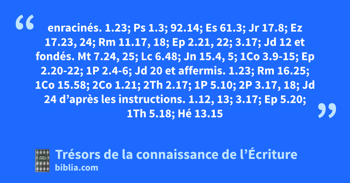 enracinés. 1.23; Ps 1.3; 92.14; Es 61.3; Jr 17.8; Ez 17.23, 24; Rm 11.17, 18; Ep 2.21, 22; 3.17; Jd 12 et fondés. Mt 7.24, 25; Lc 6.48; Jn 15.4, 5; 1Co 3.9-15; Ep 2.20-22; 1P 2.4-6; Jd 20 et affermis. 1.23; Rm 16.25; 1Co 15.58; 2Co 1.21; 2Th 2.17; 1P 5.10; 2P 3.17, 18; Jd 24 d’après les instructions. 1.12, 13; 3.17; Ep 5.20; 1Th 5.18; Hé 13.15
