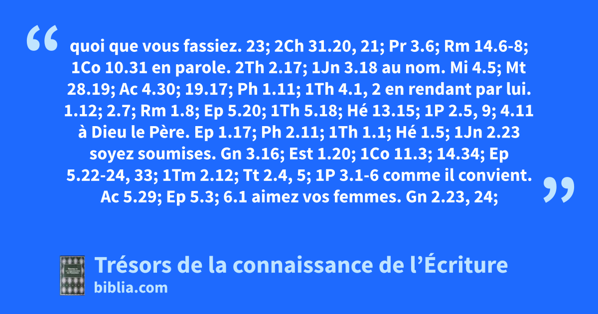 quoi que vous fassiez. 23; 2Ch 31.20, 21; Pr 3.6; Rm 14.6-8; 1Co 10.31 en parole. 2Th 2.17; 1Jn 3.18 au nom. Mi 4.5; Mt 28.19; Ac 4.30; 19.17; Ph 1.11; 1Th 4.1, 2 en rendant par lui. 1.12; 2.7; Rm 1.8; Ep 5.20; 1Th 5.18; Hé 13.15; 1P 2.5, 9; 4.11 à Dieu le Père. Ep 1.17; Ph 2.11; 1Th 1.1; Hé 1.5; 1Jn 2.23