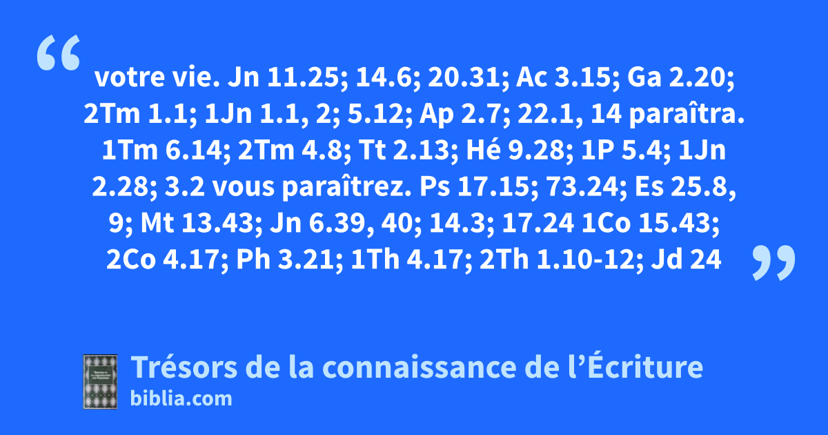 votre vie. Jn 11.25; 14.6; 20.31; Ac 3.15; Ga 2.20; 2Tm 1.1; 1Jn 1.1, 2; 5.12; Ap 2.7; 22.1, 14 paraîtra. 1Tm 6.14; 2Tm 4.8; Tt 2.13; Hé 9.28; 1P 5.4; 1Jn 2.28; 3.2 vous paraîtrez. Ps 17.15; 73.24; Es 25.8, 9; Mt 13.43; Jn 6.39, 40; 14.3; 17.24 1Co 15.43; 2Co 4.17; Ph 3.21; 1Th 4.17; 2Th 1.10-12; Jd 24