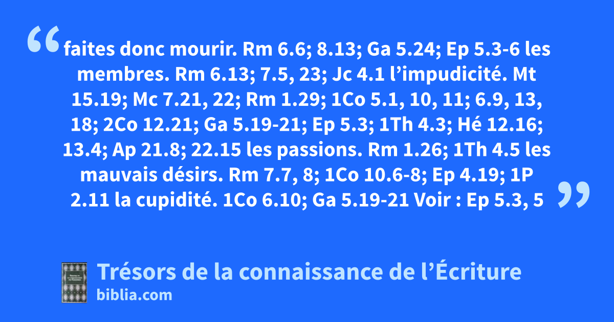 faites donc mourir. Rm 6.6; 8.13; Ga 5.24; Ep 5.3-6 les membres. Rm 6.13; 7.5, 23; Jc 4.1 l’impudicité. Mt 15.19; Mc 7.21, 22; Rm 1.29; 1Co 5.1, 10, 11; 6.9, 13, 18; 2Co 12.21; Ga 5.19-21; Ep 5.3; 1Th 4.3; Hé 12.16; 13.4; Ap 21.8; 22.15 les passions. Rm 1.26; 1Th 4.5 les mauvais désirs. Rm 7.7, 8; 1Co 10.6-8; Ep 4.19; 1P 2.11 la cupidité. 1Co 6.10; Ga 5.19-21 Voir : Ep 5.3, 5