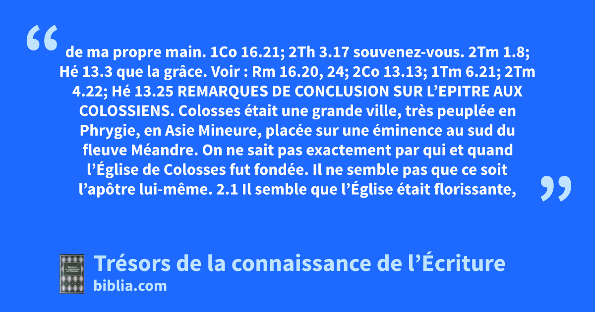 Colosses était une grande ville, très peuplée en Phrygie, en Asie Mineure, placée sur une éminence au sud du fleuve Méandre. On ne sait pas exactement par qui et quand l’Église de Colosses fut fondée. Il ne semble pas que ce soit l’apôtre lui-même. 2.1 Il semble que l’Église était florissante, puis quelques difficultés sont survenues parmi eux, ils ont donc envoyé Épaphras à Rome, où l’apôtre était emprisonné, pour l’entretenir de l’affaire. 4.3 Cette lettre est remarquable de pathétique et d’ardeur, en général attribuée aux consolations divines accordées à l’apôtre pendant ses souffrances pour la cause de Christ. Quiconque veut comprendre les épîtres aux Éphésiens et aux Colossiens, doit les lire comme formant un tout. Un passage de l’une des épîtres peut être aussi interprété par les passages parallèles de l’autre épître.
