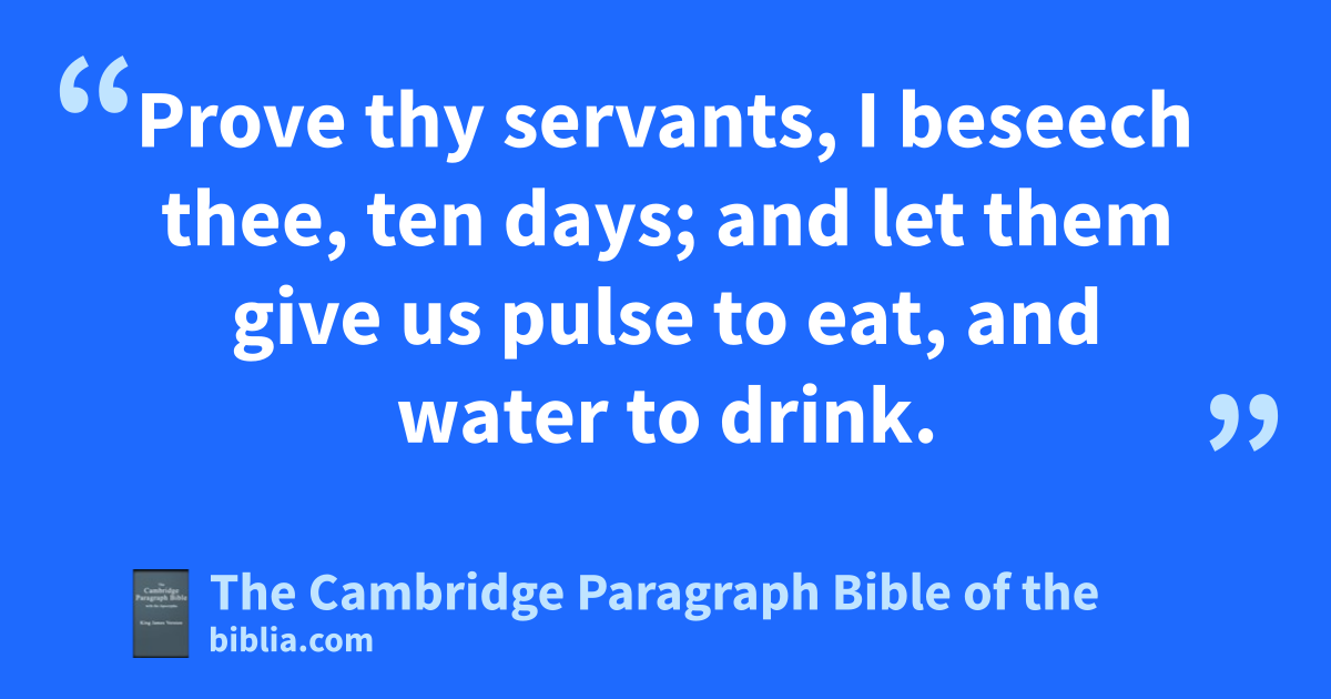 8 But Daniel vpurposed in his heart that he would not defile himself with othe portion of the king’s wxmeat, nor with wythe wine which he drank: therefore he requested of the prince of the eunuchs that he might not defile himself. 9 Now God zahad brought Daniel into favour and atender love with the prince of the eunuchs. 10 And the prince of the eunuchs said unto Daniel, I fear my lord the king, who hath appointed your meat and your drink: for why should he see your faces * worse liking than the children which are of your * sort? then shall ye make me endanger my head to the king. 11 Then said Daniel to * Melzar, whom the prince of the eunuchs had set over Daniel, Hananiah, Mishael, and Azariah, 12 Prove thy servants, I beseech thee, bten days; and let them give us * cpulse * to eat, and water to drink. 13 Then let our countenances be looked upon before thee, and the countenance of the children that eat of dthe portion of the king’s meat: and as thou seest, deal with thy servants. 14 So he consented to them in this matter, and proved them ten days. 15 And at the end of ten days their countenances appeared fairer and efatter in flesh than all the children which did eat dthe portion of the king’s meat. 16 Thus Melzar took away dthe portion of their meat, and dthe wine that they should drink; and gave them cpulse.