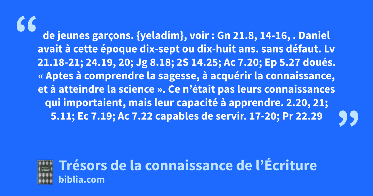 de jeunes garçons. {yeladim}, voir : Gn 21.8, 14-16, . Daniel avait à cette époque dix-sept ou dix-huit ans. sans défaut. Lv 21.18-21; 24.19, 20; Jg 8.18; 2S 14.25; Ac 7.20; Ep 5.27 doués. « Aptes à comprendre la sagesse, à acquérir la connaissance, et à atteindre la science ». Ce n’était pas leurs connaissances qui importaient, mais leur capacité à apprendre. 2.20, 21; 5.11; Ec 7.19; Ac 7.22 capables de servir. 17-20; Pr 22.29