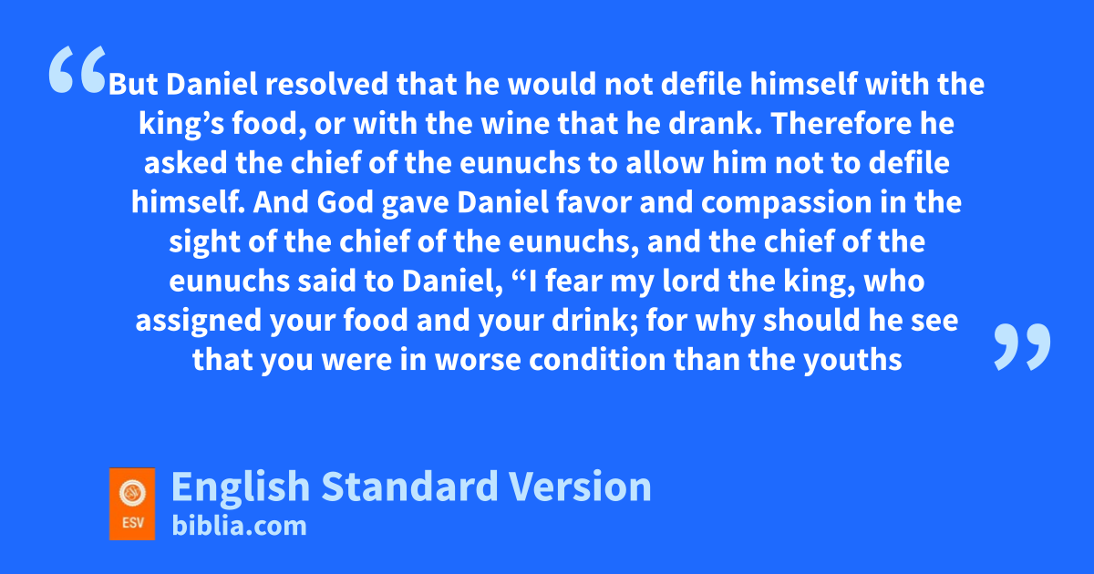 8 But Daniel sresolved that he would not tdefile himself with kthe king’s food, or with lthe wine that he drank. Therefore he asked the chief of the eunuchs to allow him not to tdefile himself. 9 uAnd God gave Daniel favor and compassion in the sight of the chief of the eunuchs, 10 and the chief of the eunuchs said to Daniel, “I fear my lord the king, who assigned your food and your drink; for why should he see that you were in worse condition than the youths who are of your own age? So you would endanger my head with the king.” 11 Then Daniel said to the steward whom the chief of the eunuchs had assigned over Daniel, Hananiah, Mishael, and Azariah, 12 “Test your servants for vten days; let us be given vegetables to eat and water to drink. 13 Then let our appearance and the appearance of the youths who eat kthe king’s food be observed by you, and deal with your servants according to what you see.” 14 So he listened to them in this matter, and tested them for ten days. 15 At the end of ten days it was seen that they were better in appearance and fatter in flesh than all the youths who ate kthe king’s food. 16 wSo the steward took away their food and the wine they were to drink, and gave them xvegetables.