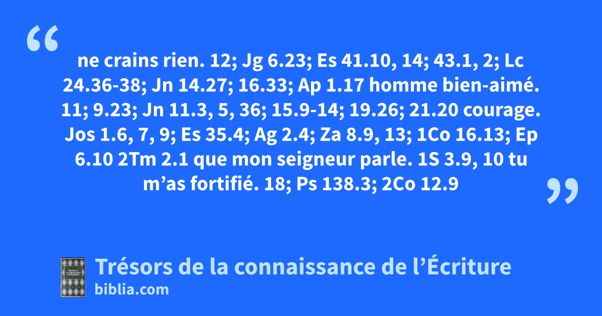 ne crains rien. 12; Jg 6.23; Es 41.10, 14; 43.1, 2; Lc 24.36-38; Jn 14.27; 16.33; Ap 1.17 homme bien-aimé. 11; 9.23; Jn 11.3, 5, 36; 15.9-14; 19.26; 21.20 courage. Jos 1.6, 7, 9; Es 35.4; Ag 2.4; Za 8.9, 13; 1Co 16.13; Ep 6.10 2Tm 2.1 que mon seigneur parle. 1S 3.9, 10 tu m’as fortifié. 18; Ps 138.3; 2Co 12.9