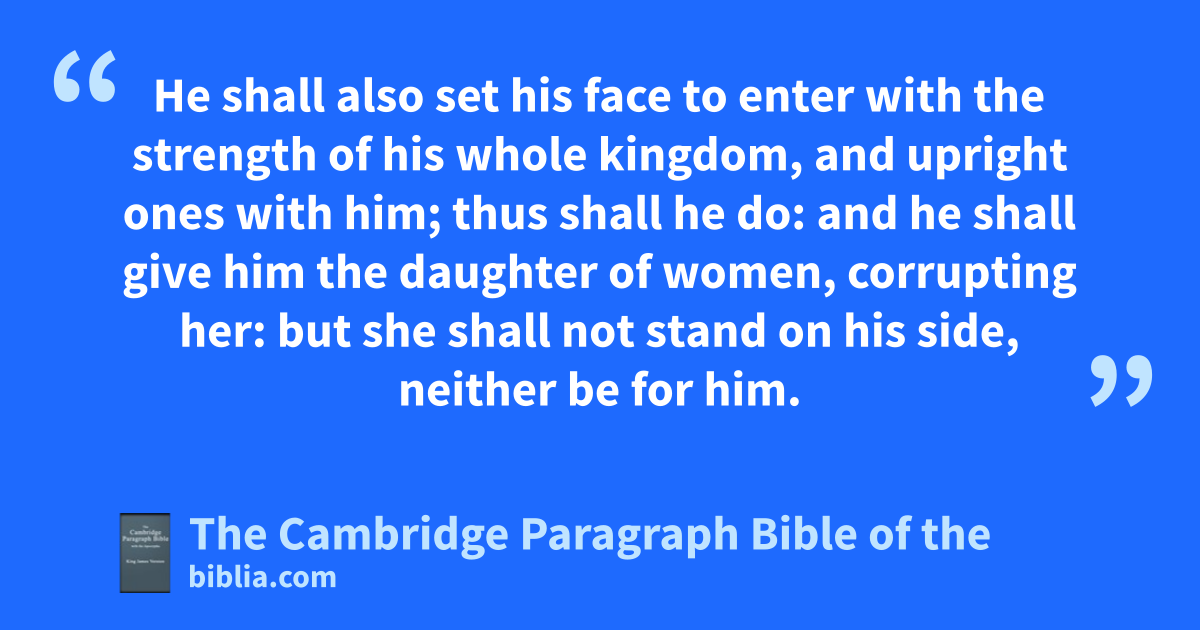 5 And the king of the south shall be strong, and one of his princes; and he shall be strong above him, and have dominion; his dominion shall be a great dominion. 6 And in the end of years they * shall join themselves together; for the king’s daughter of the south shall come to the king of the north to make * an agreement: but she ishall not retain the power of the arm; neither shall he stand, nor his arm: but she shall be given up, and kthey that brought her, and * he that begat her, and he that strengthened her in these times. 7 But out of a branch of her roots shall one stand up * in his estate, which shall come with an army, and shall enter into othe fortress of the king of the north, and shall deal against them, and shall prevail: 8 and shall also carry captives into Egypt their gods, with their lprinces, and with * their precious vessels of silver and of gold; and he shall continue more years than the king of the north. 9 So the king of the south shall come into his kingdom, and shall return into his own land. 10 But his sons * mshall be stirred up, and shall assemble a multitude of great forces: and one shall certainly come, and noverflow, nand pass through: * then shall he return, and be stirred up, oeven to his fortress. 11 And the king of the south pshall be moved with choler, and shall come forth and fight with him, even with the king of the north: and qhe shall set forth a great multitude; but the multitude shall be given into his hand. 12 And when he hath taken away the multitude, his heart shall be lifted up; and he shall cast down many ten thousands: but he shall not be strengthened by it. 13 For the king of the north shall return, and qshall set forth a multitude greater than the former, and shall certainly come * after certain years with a great army and with much riches. 14 And in those times there shall many stand up against the king of the south: also * rthe robbers of thy people shall exalt themselves sto establish the vision; but tthey shall fall. 15 So the king of the north shall come, and ucast up a mount, and take * the most fenced cities: and the arms of the south shall not withstand, neither * his chosen people, neither shall there be any strength to withstand. 16 But he that cometh against him eshall do according to his own will, and wnone shall stand before him: and he shall stand in the * * glorious land, which by his hand shall be consumed. 17 He shall also xset his face to enter with the strength of his whole kingdom, and * upright ones with him; thus shall he do: and he shall give him the daughter of women, * corrupting her: but she shall not stand on his side, yneither be for him. 18 After this shall he turn his face unto the isles, and shall take many: but za prince * for his own behalf shall cause * the reproach offered by him to cease; without zzhis own reproach he shall cause it to turn upon him. 19 Then he shall turn his face towards othe fort of his own land: but tahe shall stumble aand fall, band not be found. 20 Then shall stand up * in his estate * da raiser of taxes in the glory of the kingdom: but within efew days he shall be destroyed, neither in * anger, nor in battle.