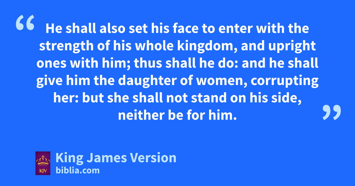 5 And the king of the south shall be strong, and one of his princes; and he shall be strong above him, and have dominion; his dominion shall be a great dominion. 6 And in the end of years they †shall join themselves together; for the king’s daughter of the south shall come to the king of the north to make †an agreement: but she ishall not retain the power of the arm; neither shall he stand, nor his arm: but she shall be given up, and kthey that brought her, and ||he that begat her, and he that strengthened her in these times. 7 But out of a branch of her roots shall one stand up ||in his estate, which shall come with an army, and shall enter into othe fortress of the king of the north, and shall deal against them, and shall prevail: 8 And shall also carry captives into Egypt their gods, with their lprinces, and with †their precious vessels of silver and of gold; and he shall continue more years than the king of the north. 9 So the king of the south shall come into his kingdom, and shall return into his own land. 10 But his sons ||mshall be stirred up, and shall assemble a multitude of great forces: and one shall certainly come, and noverflow, nand pass through: ||then shall he return, and be stirred up, oeven to his fortress. 11 And the king of the south pshall be moved with choler, and shall come forth and fight with him, even with the king of the north: and qhe shall set forth a great multitude; but the multitude shall be given into his hand. 12 And when he hath taken away the multitude, his heart shall be lifted up; and he shall cast down many ten thousands: but he shall not be strengthened by it. 13 For the king of the north shall return, and qshall set forth a multitude greater than the former, and shall certainly come †after certain years with a great army and with much riches. 14 And in those times there shall many stand up against the king of the south: also †rthe robbers of thy people shall exalt themselves sto establish the vision; but tthey shall fall. 15 So the king of the north shall come, and ucast up a mount, and take †the most fenced cities: and the arms of the south shall not withstand, neither †his chosen people, neither shall there be any strength to withstand. 16 But he that cometh against him eshall do according to his own will, and wnone shall stand before him: and he shall stand in the ||†glorious land, which by his hand shall be consumed. 17 He shall also xset his face to enter with the strength of his whole kingdom, and ||upright ones with him; thus shall he do: and he shall give him the daughter of women, †corrupting her: but she shall not stand on his side, yneither be for him. 18 After this shall he turn his face unto the isles, and shall take many: but za prince †for his own behalf shall cause †the reproach offered by him to cease; without zzhis own reproach he shall cause it to turn upon him. 19 Then he shall turn his face toward othe fort of his own land: but tahe shall stumble aand fall, band not be found. 20 Then shall stand up ||in his estate †da raiser of taxes in the glory of the kingdom: but within efew days he shall be destroyed, neither in †anger, nor in battle.