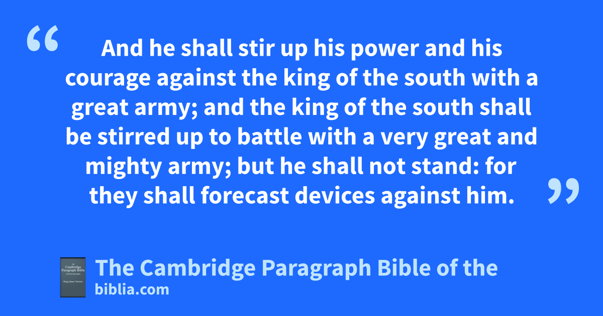 5 And the king of the south shall be strong, and one of his princes; and he shall be strong above him, and have dominion; his dominion shall be a great dominion. 6 And in the end of years they * shall join themselves together; for the king’s daughter of the south shall come to the king of the north to make * an agreement: but she ishall not retain the power of the arm; neither shall he stand, nor his arm: but she shall be given up, and kthey that brought her, and * he that begat her, and he that strengthened her in these times. 7 But out of a branch of her roots shall one stand up * in his estate, which shall come with an army, and shall enter into othe fortress of the king of the north, and shall deal against them, and shall prevail: 8 and shall also carry captives into Egypt their gods, with their lprinces, and with * their precious vessels of silver and of gold; and he shall continue more years than the king of the north. 9 So the king of the south shall come into his kingdom, and shall return into his own land. 10 But his sons * mshall be stirred up, and shall assemble a multitude of great forces: and one shall certainly come, and noverflow, nand pass through: * then shall he return, and be stirred up, oeven to his fortress. 11 And the king of the south pshall be moved with choler, and shall come forth and fight with him, even with the king of the north: and qhe shall set forth a great multitude; but the multitude shall be given into his hand. 12 And when he hath taken away the multitude, his heart shall be lifted up; and he shall cast down many ten thousands: but he shall not be strengthened by it. 13 For the king of the north shall return, and qshall set forth a multitude greater than the former, and shall certainly come * after certain years with a great army and with much riches. 14 And in those times there shall many stand up against the king of the south: also * rthe robbers of thy people shall exalt themselves sto establish the vision; but tthey shall fall. 15 So the king of the north shall come, and ucast up a mount, and take * the most fenced cities: and the arms of the south shall not withstand, neither * his chosen people, neither shall there be any strength to withstand. 16 But he that cometh against him eshall do according to his own will, and wnone shall stand before him: and he shall stand in the * * glorious land, which by his hand shall be consumed. 17 He shall also xset his face to enter with the strength of his whole kingdom, and * upright ones with him; thus shall he do: and he shall give him the daughter of women, * corrupting her: but she shall not stand on his side, yneither be for him. 18 After this shall he turn his face unto the isles, and shall take many: but za prince * for his own behalf shall cause * the reproach offered by him to cease; without zzhis own reproach he shall cause it to turn upon him. 19 Then he shall turn his face towards othe fort of his own land: but tahe shall stumble aand fall, band not be found. 20 Then shall stand up * in his estate * da raiser of taxes in the glory of the kingdom: but within efew days he shall be destroyed, neither in * anger, nor in battle.