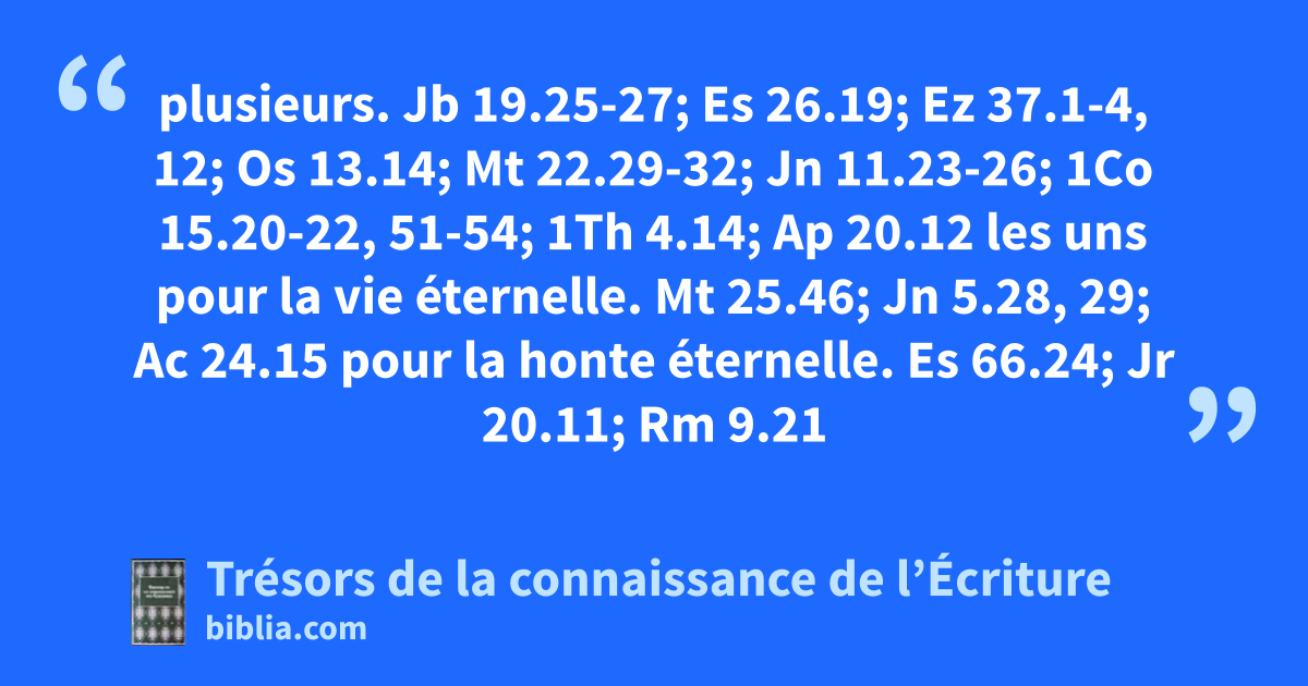 plusieurs. Jb 19.25-27; Es 26.19; Ez 37.1-4, 12; Os 13.14; Mt 22.29-32; Jn 11.23-26; 1Co 15.20-22, 51-54; 1Th 4.14; Ap 20.12 les uns pour la vie éternelle. Mt 25.46; Jn 5.28, 29; Ac 24.15 pour la honte éternelle. Es 66.24; Jr 20.11; Rm 9.21
