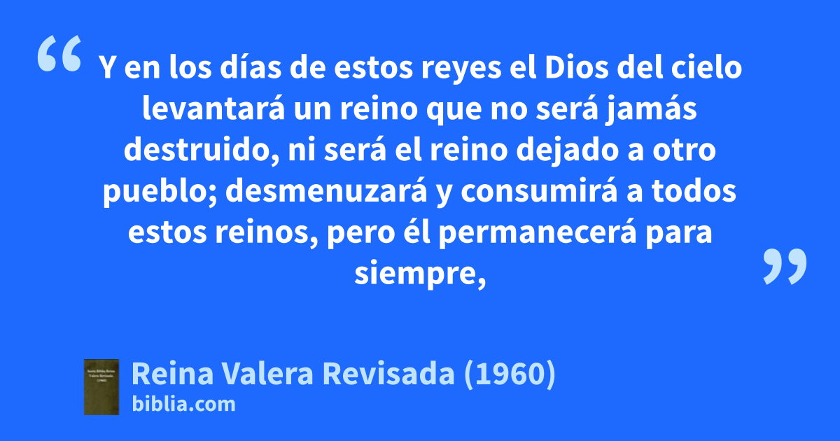36Este es el sueño; también la interpretación de él diremos en presencia del rey. 37Tú, oh rey, eres rey de reyes; porque el Dios del cielo te ha dado reino, poder, fuerza y majestad. 38Y dondequiera que habitan hijos de hombres, bestias del campo y aves del cielo, él los ha entregado en tu mano, y te ha dado el dominio sobre todo; tú eres aquella cabeza de oro. 39Y después de ti se levantará otro reino inferior al tuyo; y luego un tercer reino de bronce, el cual dominará sobre toda la tierra. 40Y el cuarto reino será fuerte como hierro; y como el hierro desmenuza y rompe todas las cosas, desmenuzará y quebrantará todo. 41Y lo que viste de los pies y los dedos, en parte de barro cocido de alfarero y en parte de hierro, será un reino dividido; mas habrá en él algo de la fuerza del hierro, así como viste hierro mezclado con barro cocido. 42Y por ser los dedos de los pies en parte de hierro y en parte de barro cocido, el reino será en parte fuerte, y en parte frágil. 43Así como viste el hierro mezclado con barro, se mezclarán por medio de alianzas humanas; pero no se unirán el uno con el otro, como el hierro no se mezcla con el barro. 44Y en los días de estos reyes el Dios del cielo levantará un reino que no será jamás destruido, ni será el reino dejado a otro pueblo; desmenuzará y consumirá a todos estos reinos, pero él permanecerá para siempre, 45de la manera que viste que del monte fue cortada una piedra, no con mano, la cual desmenuzó el hierro, el bronce, el barro, la plata y el oro. El gran Dios ha mostrado al rey lo que ha de acontecer en lo por venir; y el sueño es verdadero, y fiel su interpretación.