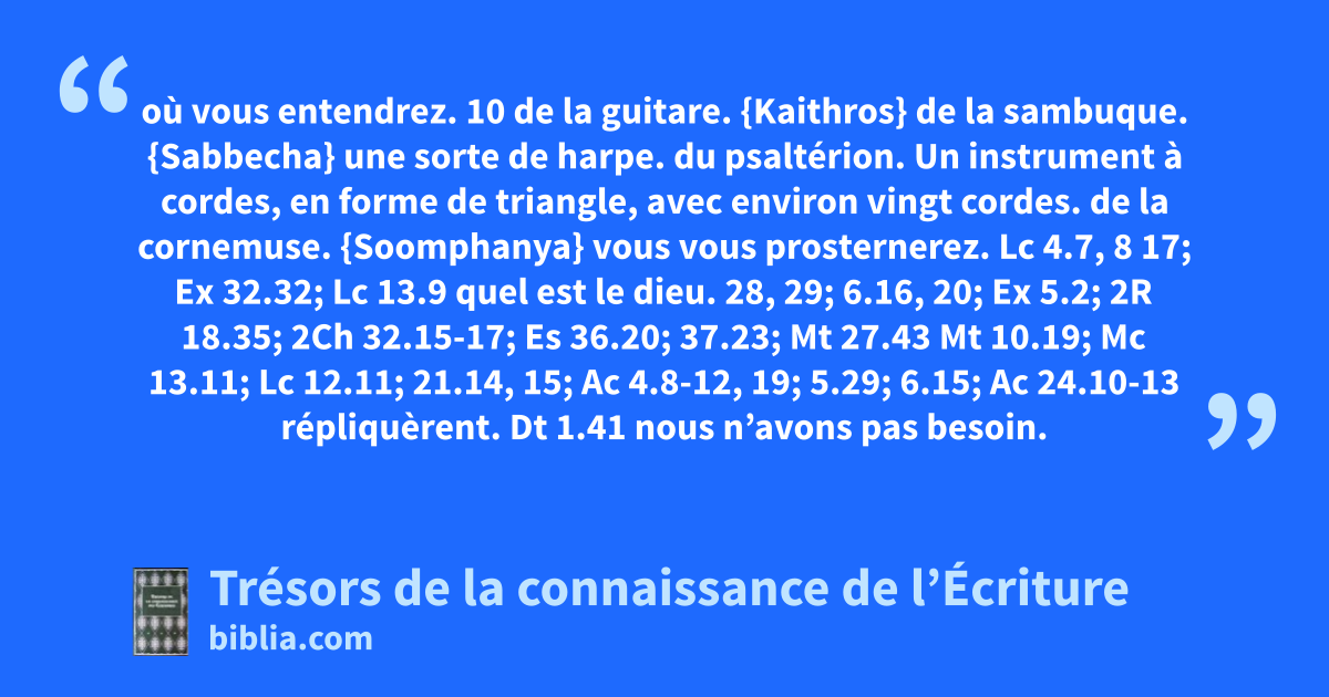 où vous entendrez. 10 de la guitare. {Kaithros} de la sambuque. {Sabbecha} une sorte de harpe. du psaltérion. Un instrument à cordes, en forme de triangle, avec environ vingt cordes. de la cornemuse. {Soomphanya} vous vous prosternerez. Lc 4.7, 8 17; Ex 32.32; Lc 13.9 quel est le dieu. 28, 29; 6.16, 20; Ex 5.2; 2R 18.35; 2Ch 32.15-17; Es 36.20; 37.23; Mt 27.43 Mt 10.19; Mc 13.11; Lc 12.11; 21.14, 15; Ac 4.8-12, 19; 5.29; 6.15; Ac 24.10-13